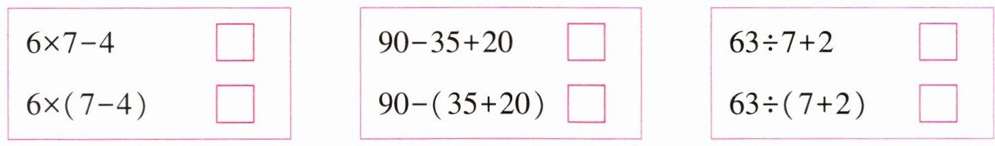 $\begin{array}{ll}6×7-4& □ \\ 6×(7-4)& □ \end{array}$