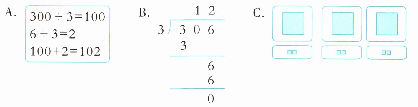 $\begin{array}{l}300 ÷ 3 = 100 \\6 ÷ 3 = 2 \\100 + 2 = 102\end{array}$