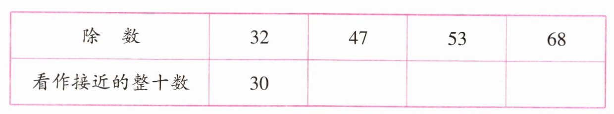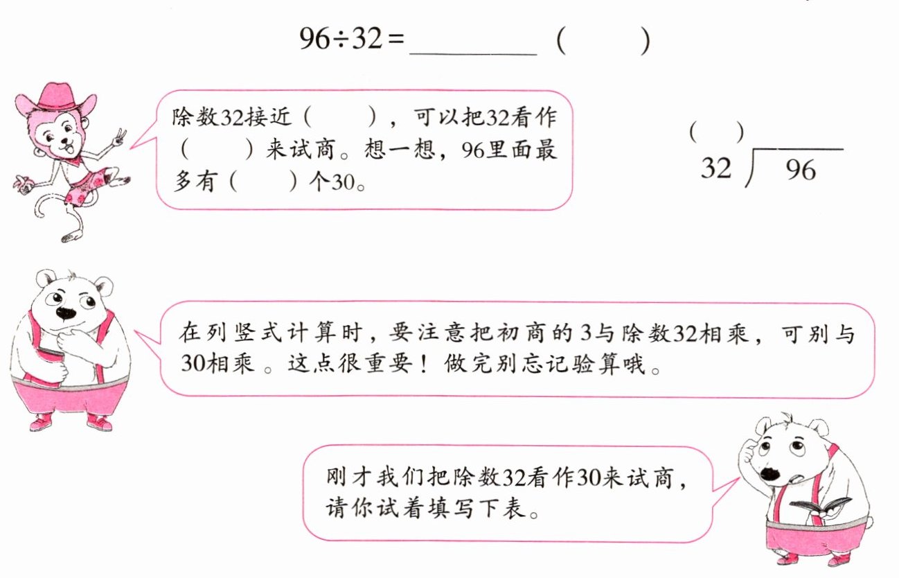 除数$32$接近($30$),可以把$32$看作($30$)来试商。想一想,$96$里面最多有($3$)个$30$。