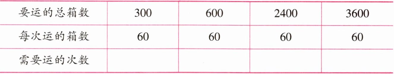 3. 一辆卡车每次可以运60箱苹果,用这辆卡车运300箱苹果,几次才能运完?如果运600箱苹果呢?运2400箱、3600箱呢?你有什么发现?