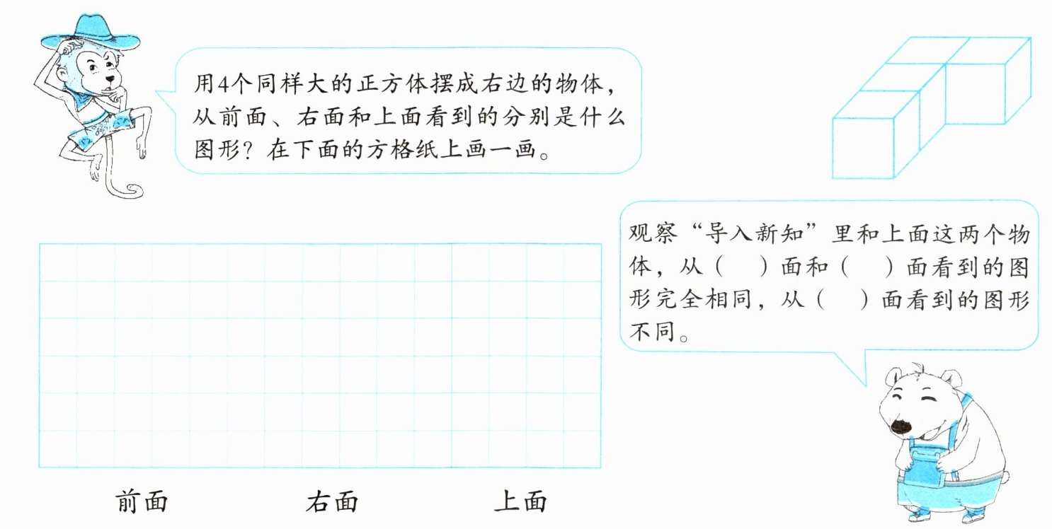 1. 从前面、右面和上面观察物体,各是从哪个面可以看到