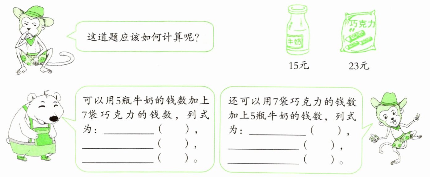 )。还可以用7袋巧克力的钱数加上5瓶牛奶的钱数,列式为:______(