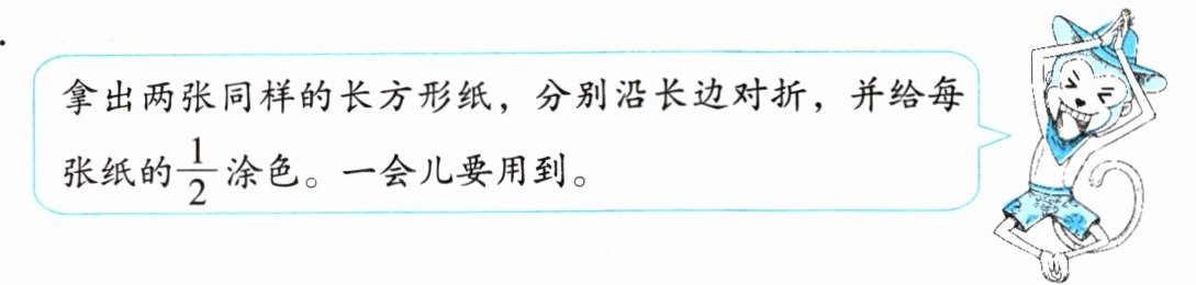 拿出两张同样的长方形纸,分别沿长边对折,并给每张纸的$$ \frac{1}{2} $$涂色。一会儿要用到。