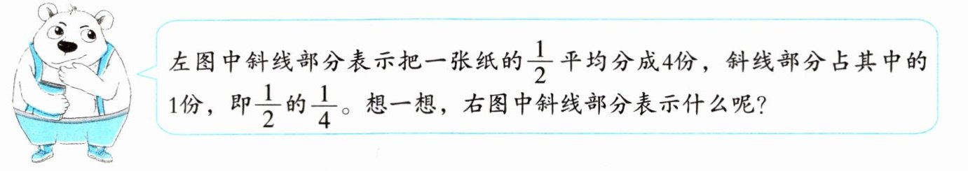 左图中斜线部分表示把一张纸的$$ \frac{1}{2} $$平均分成4份,斜线部分占其中的1份,即$$ \frac{1}{2} $$的$$ \frac{1}{4} $$。想一想,右图中斜线部分表示什么呢?