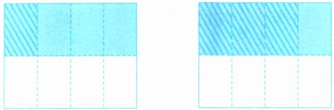 左图斜线部分占$\frac{1}{2}$的$\frac{1}{4}$,是这张纸的$\frac{1}{8}$;右图斜线部分占$\frac{1}{2}$的$\frac{3}{4}$,是这张纸的$\frac{3}{8}$。