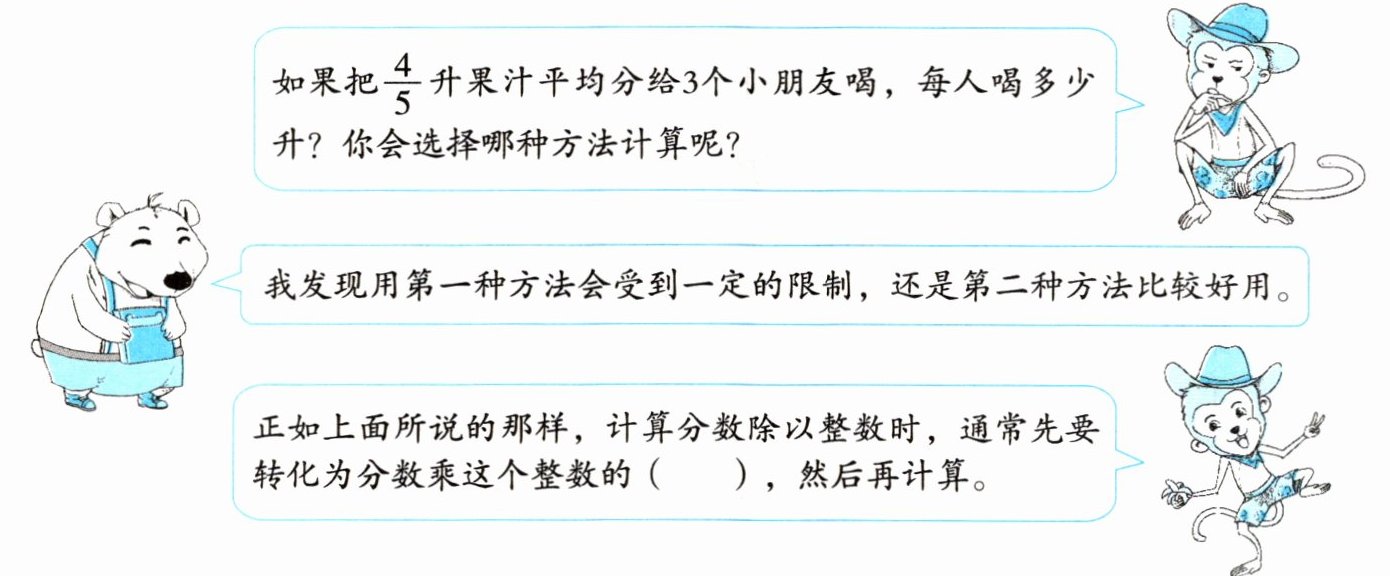 正如上面所说的那样,计算分数除以整数时,通常先要转化为分数乘这个整数的(),然后再计算。