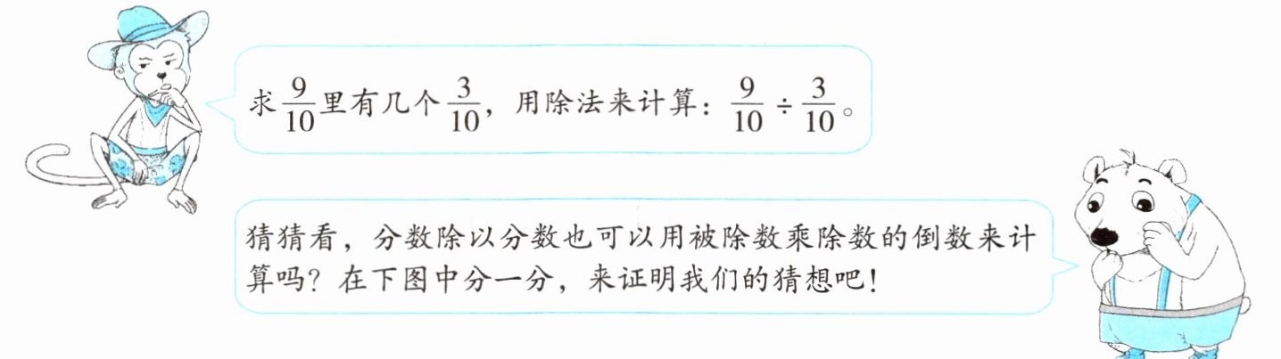 猜猜看,分数除以分数也可以用被除数乘除数的倒数来计算吗?在下图中分一分,来证明我们的猜想吧!