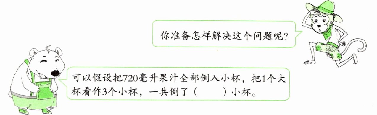 可以假设把720毫升果汁全部倒入小杯,把1个大杯看作3个小杯,一共倒了( )小杯。