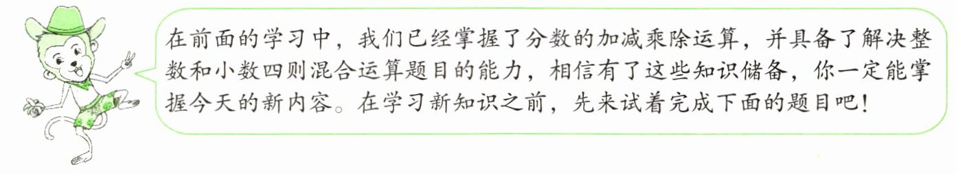 在前面的学习中,我们已经掌握了分数的加减乘除运算,并具备了解决整数和小数四则混合运算题目的能力,相信有了这些知识储备,你一定能掌握今天的新内容。在学习新知识之前,先来试着完成下面的题目吧!
