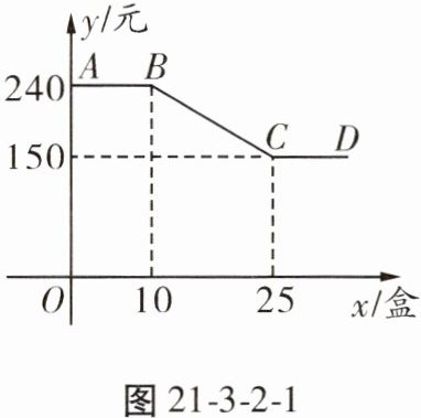 10. 中秋节前夕,某公司的李会计受公司委派去超市购买若干盒月饼,超市给出了某种月饼不同购买数量的价格优惠,如图21-3-2-1,折线$ABCD表示购买这种月饼每盒的价格y$(元)与盒数$x$(盒)之间的函数关系。