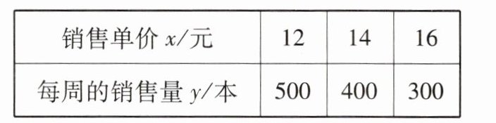 【例1】小红经营的网店以销售文具为主,其中一款笔记本进价为每本10元,该网店在试销售期间发现,每周销售数量y(本)与销售单价x(元)之间满足一次函数关系,三对对应值如下表: