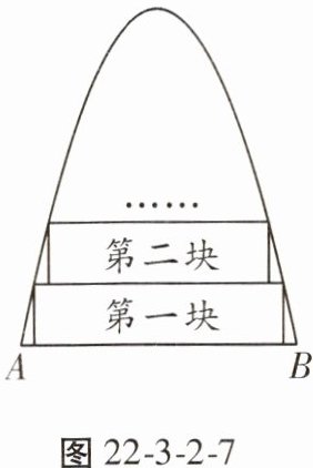 7. 如图22-3-2-7,一块铁片边缘是由抛物线和线段AB组成的,测得$AB = 20$cm,抛物线的顶点到AB边的距离为25cm。现要沿AB边向上依次截取宽度均为4cm的矩形铁皮,从下往上依次是第一块,第二块,……已知截得的铁皮中有一块是正方形,则这块正方形铁皮是第