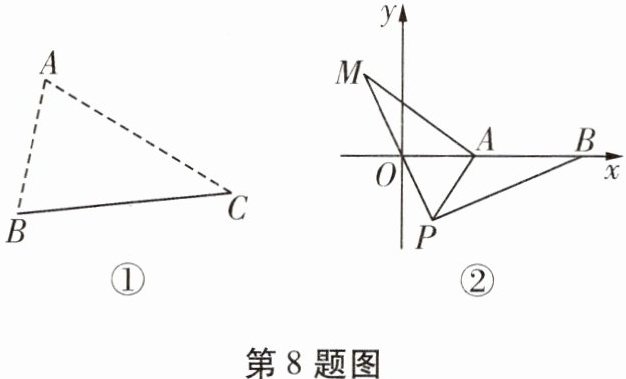 (2)拓展:如图②,在平面直角坐标系中,点A的坐标为$(2,0)$,点B的坐标为$(6,0)$,点P为线段AB外一动点,且$PA= 2$,$PM= PB$,$\angle BPM= 90^{\circ}$,请直接写出线段AM的长的最大值及此时点P的坐标。