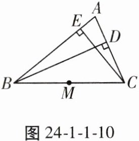 10. 如图24 - 1 - 1 - 10,$ BD $,$ CE $ 是 $ \triangle ABC $ 的高,$ M $ 为 $ BC $ 的中点。试说明点 $ B $,$ C $,$ D $,$ E $ 在以点 $ M $ 为圆心的同一个圆上。