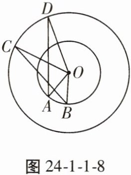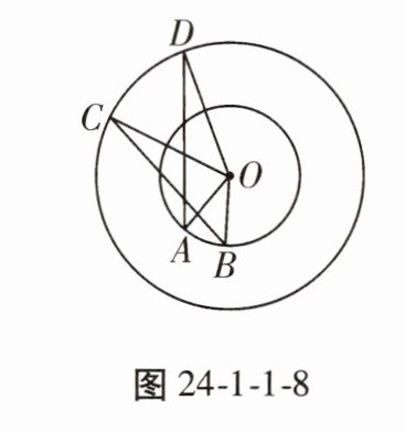 8. 如图24 - 1 - 1 - 8,点 $ A $,$ B $ 和点 $ C $,$ D $ 分别在两个同心圆上,且 $ \angle AOB = \angle COD $。求证:$ \angle C = \angle D $。