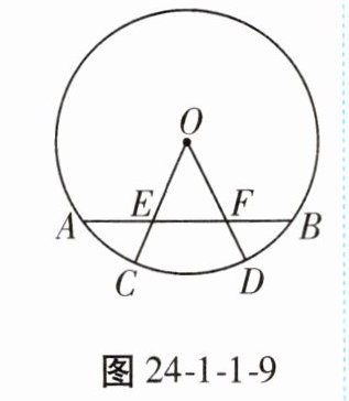 9. 如图24 - 1 - 1 - 9,$ AB $ 是 $ \odot O $ 的弦,半径 $ OC $,$ OD $ 分别交 $ AB $ 于点 $ E $,$ F $,且 $ AE = BF $,请你判断线段 $ OE $ 与 $ OF $ 的数量关系,并给予证明。