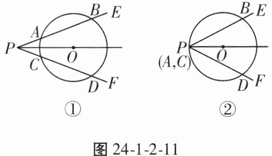 10. 如图24-1-2-11①,已知点 $ O $ 是 $ \angle EPF $ 的平分线上的一点,以点 $ O $ 为圆心的圆与角两边分别交于 $ A $,$ B $ 和 $ C $,$ D $ 四点。