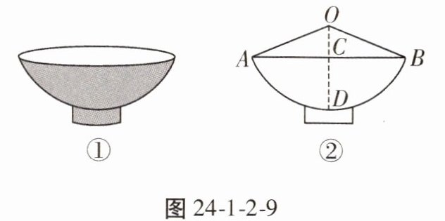 8. (2023陕西中考)陕西饮食文化源远流长,“老碗面”是陕西地方特色美食之一。图24-1-2-9②是图①从正面看到的一个“老碗”的形状示意图,$ \overset{\frown}{AB} $ 是 $ \odot O $ 的一部分,$ D $ 是 $ \overset{\frown}{AB} $ 的中点,连接 $ OD $,与弦 $ AB $ 交于点 $ C $,连接 $ OA $,$ OB $。已知 $ AB = 24 $ cm,碗深 $ CD = 8 $ cm,则 $ \odot O $ 的半径 $ OA $ 为(