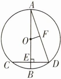 9. 如图24-1-2-10,$ AB $ 是 $ \odot O $ 的直径,弦 $ CD \perp AB $,垂足为 $ E $,连接 $ AD $,过点 $ O $ 作 $ OF \perp AD $,垂足为 $ F $,若 $ CD = 6 $,$ BE = 1 $,求 $ \triangle AOF $ 的面积。