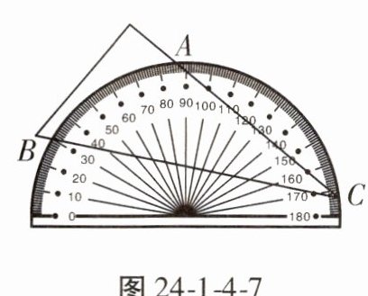3. 将量角器按如图24-1-4-7所示的方式放置在三角形纸板上,使点$C$在半圆上,点$A$,$B的读数分别为86^{\circ}$,$30^{\circ}$,则$\angle ACB$的大小为(