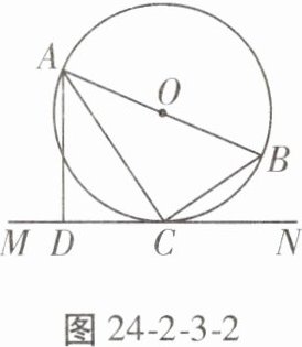 【例1】如图24-2-3-2,AB是⊙O的直径,C是⊙O上的一点,直线MN经过点C,过点A作直线MN的垂线,垂足为点D,且∠BAC= ∠CAD。求证:直线MN是⊙O的切线。