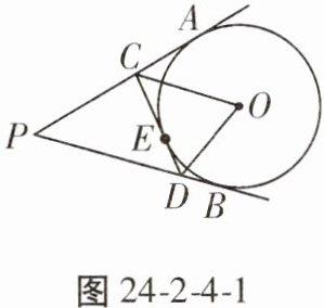 【例1】如图24-2-4-1,P为⊙O外一点,PA,PB分别切⊙O于A,B两点,CD切⊙O于点E,分别交PA,PB于点C,D。若PA= 5,则△PCD的周长和∠COD分别为(