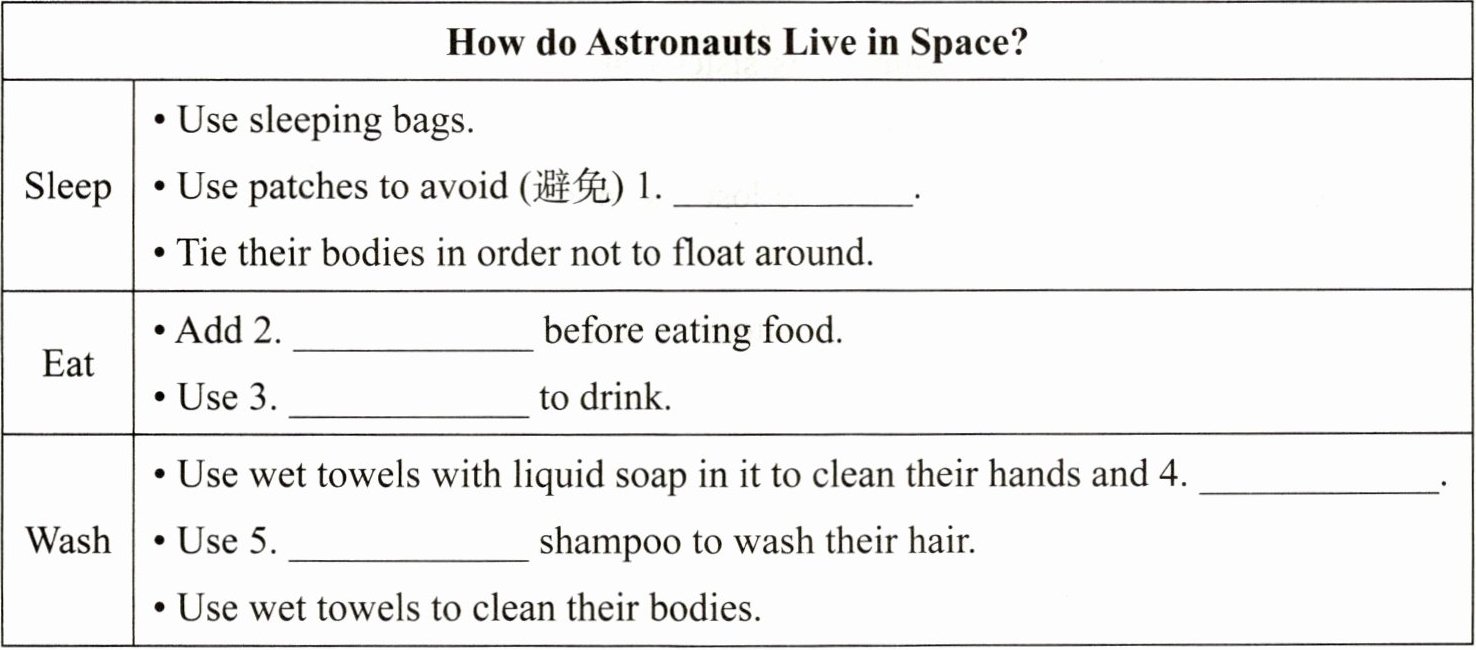 What do they eat? Food for astronauts is different from what we eat on Earth. The water in the food is removed (去除). This way, it doesn’t take up too much space. Astronauts add some water and warm the food before eating it. 3. ______ No, they use straws (吸管).