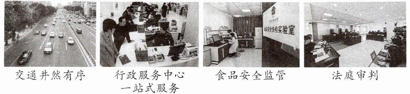 1. 交通井然有序:生活方面——公共交通秩序;法律法规——《中华人民共和国道路交通安全法》;国家公职人员——交通警察(交警)。