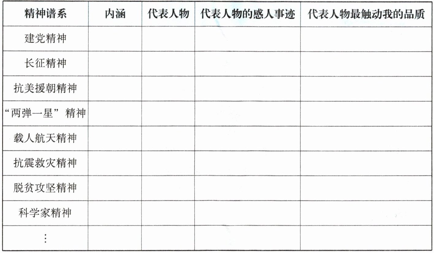| 精神谱系 | 内涵 | 代表人物 | 代表人物的感人事迹 | 代表人物最触动我的品质 |