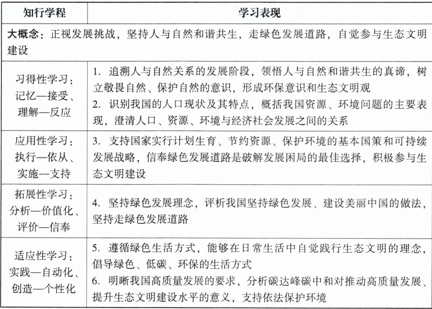 | 拓展性学习:分析—价值化、评价—信奉 | 4. 坚持绿色发展理念,评析我国坚持绿色发展、建设美丽中国的做法,坚持走绿色发展道路 |