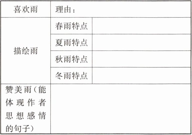 《雨的四季》读书卡 喜欢雨 理由:雨永远是美的 描绘雨 春雨特点 清新、润泽、甜美 夏雨特点 热烈、粗犷、奔放 秋雨特点 端庄、沉静、深情 冬雨特点 自然、平静、有特殊的温暖 赞美雨(能体现作者思想感情的句子) 啊,总是美丽而使人爱恋的雨啊!