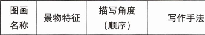 |图画名称|景物特征|描写角度(顺序)|写作手法|