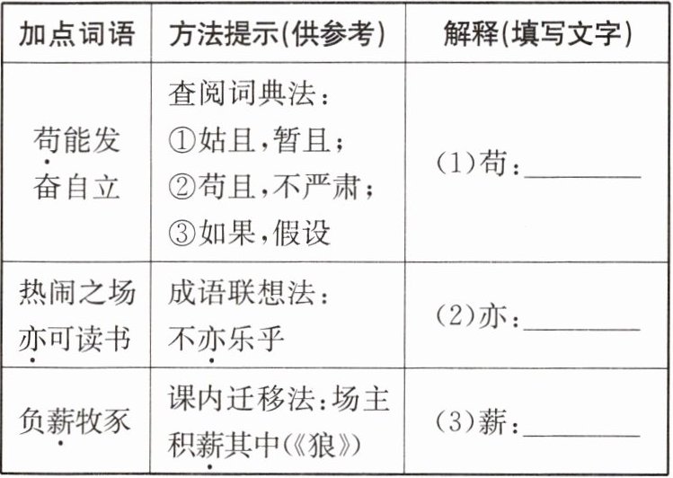 |加点词语|方法提示(供参考)|解释(填写文字)|