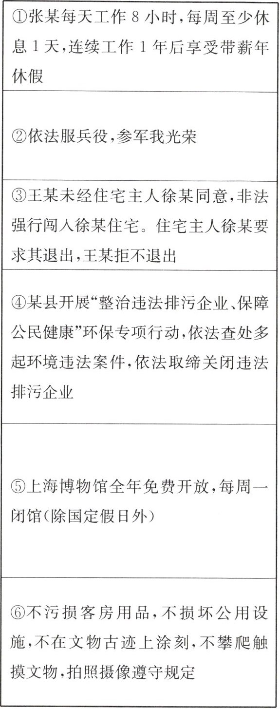 |①张某每天工作8小时,每周至少休息1天,连续工作1年后享受带薪年休假|A.第三十九条 中华人民共和国公民的住宅不受侵犯。禁止非法搜查或者非法侵入公民的住宅|