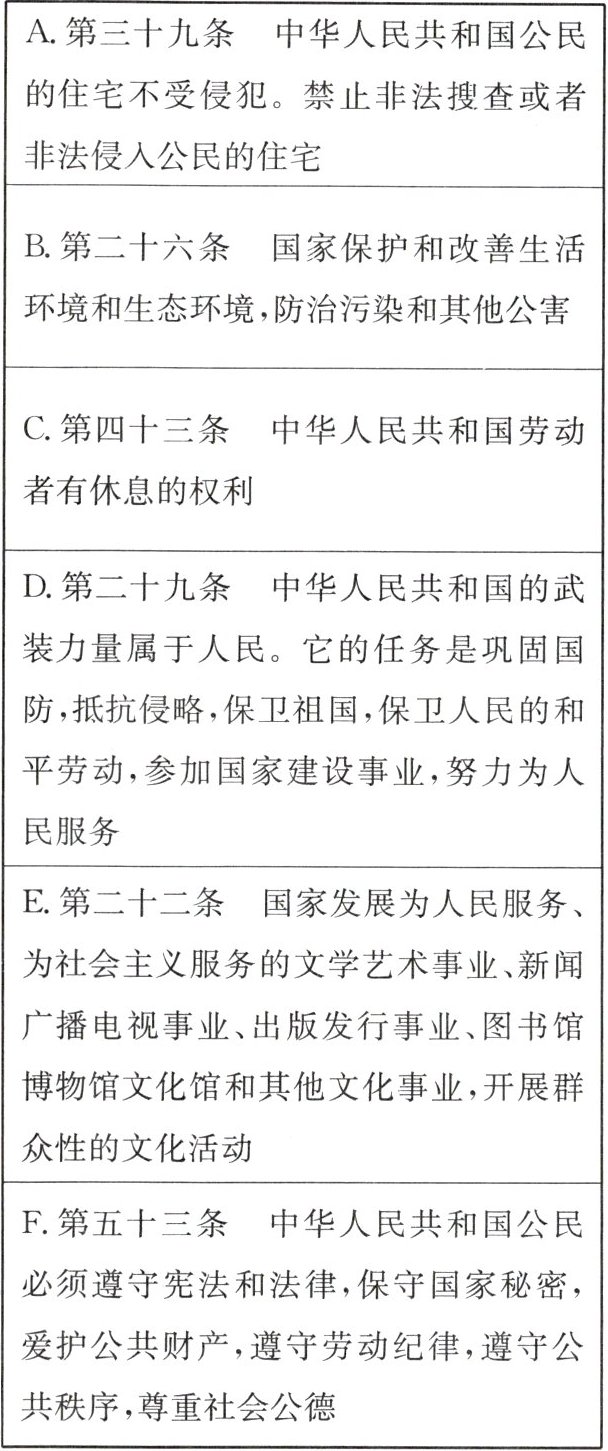下面列出了宪法的部分条款和一些生活中的场景,请你把对应的字母与序号内容连起来。
