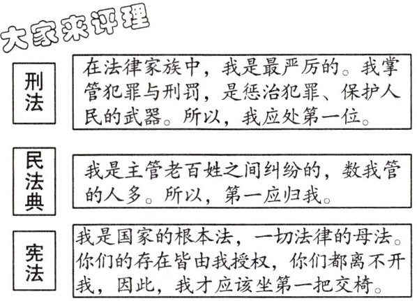 1. “法律家族聚会”开场了,大家开始争做“老大”。请你来评评理吧!