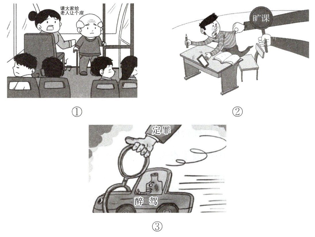 ①道德;②纪律;③法律。纪律、道德与法律都规范着我们的行为。与纪律、道德不同,法律由国家制定和颁布,具有强制力和权威性。所有社会成员都要遵守法律,依法行使自己的权利,依法履行自己的义务。