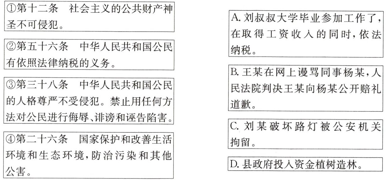 |①第十二条 社会主义的公共财产神圣不可侵犯。|A. 刘叔叔大学毕业参加工作了,在取得工资收入的同时,依法纳税。|