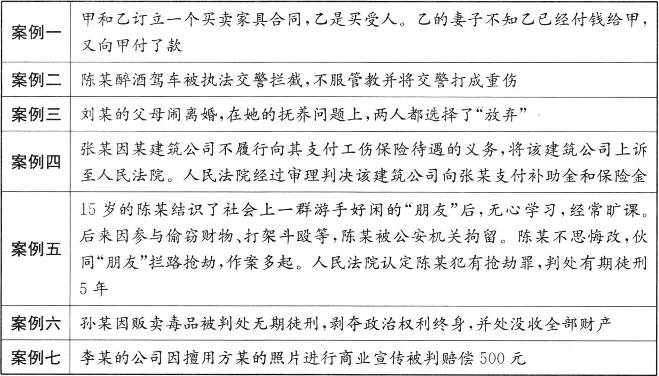 涉及刑法:案例二、五、六。涉及民法:案例一、三、四、七。