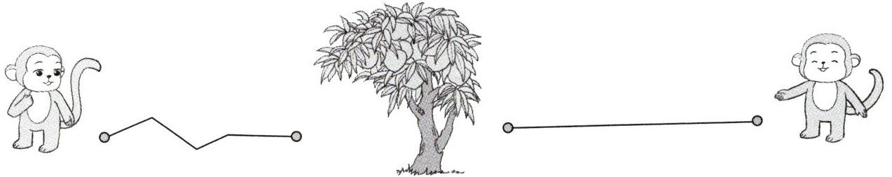 左边的小猴能更快地摘到桃子。(以桃子位置为圆心,分别以两只小猴到桃子的距离为半径画圆,通过圆规截取比较,左边小猴距离更近)