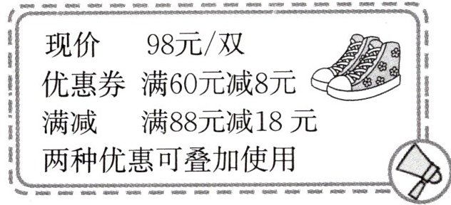 四、如图,李阿姨网购时抢到了一张“满$60元减8$元”的优惠券,她想买一双下面这样的鞋,实际需要支付多少钱?(不考虑运费。)