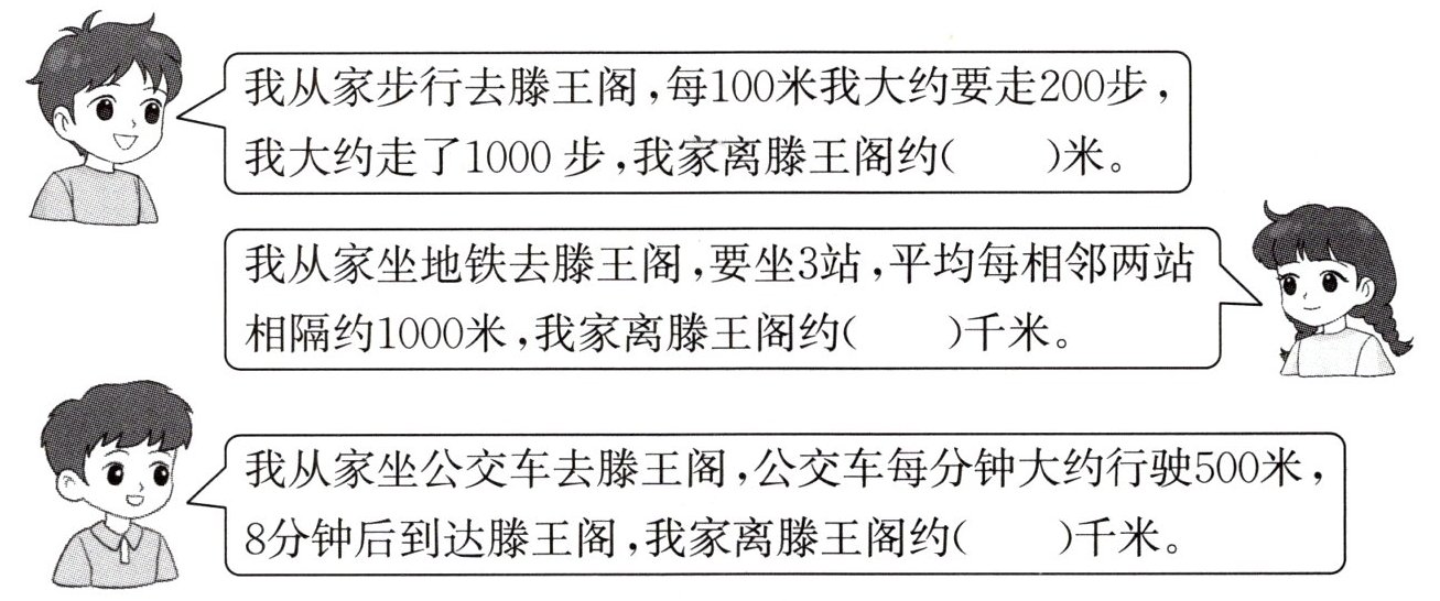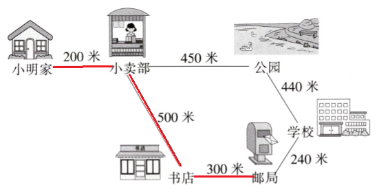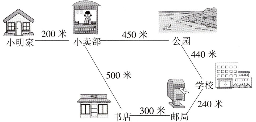 从小明家出发,到什么地方所行路程正好是 1 千米?在图上用彩色笔画出来。