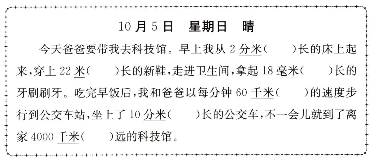 三、下面是淘淘的日记。用所学的知识帮助他改正日记中的单位错误。