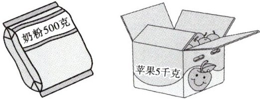 1. 左图物品为奶粉,标注“500克”,表示这袋奶粉的质量是500克。
