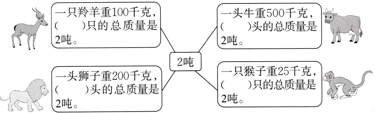 三、在( )里填上合适的数,使每种动物的总质量正好是 $ 2 $ 吨。