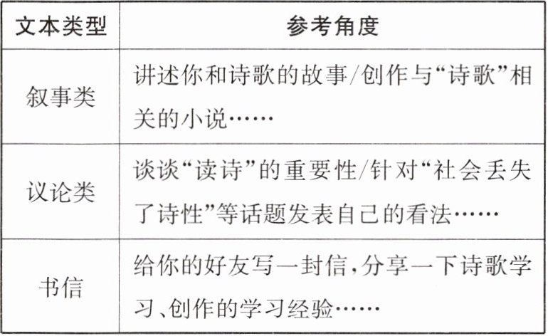 叶嘉莹先生说,读诗和写诗是生命的本能。在以往的学习中,我们接触了不少的古典和现代诗歌,本单元我们又进行了诗歌活动探究学习和《艾青诗选》等经典名著的阅读。对于“诗歌”,你有怎样的体验、感受和思考?请根据你的学习经历和表格提示,完成写作。