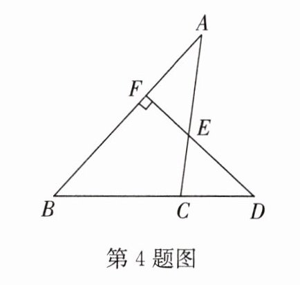 4. 如图,已知 $D$ 为 $\triangle ABC$ 边 $BC$ 延长线上的一点,$DF\perp AB$ 于点 $F$,交 $AC$ 于点 $E$,若 $\angle A = 35^{\circ}$,$\angle D = 42^{\circ}$,则 $\angle ACD$ 的度数为 。