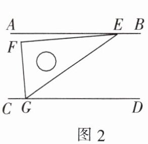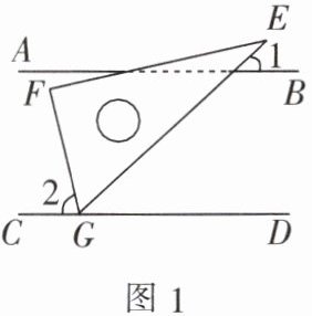 (2)如图2,小颖把三角尺的两个锐角的顶点 $E$,$G$ 分别放在 $AB$ 和 $CD$ 上,请你探索并说明 $\angle AEF$ 与 $\angle FGC$ 间的数量关系。