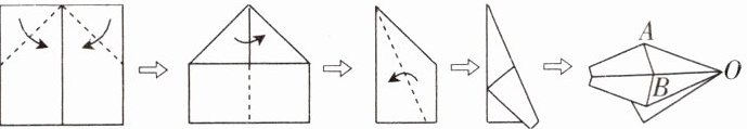 10. 如图,小明将一张正方形纸片按这样的顺序折叠成纸飞机,当机翼展开在同一平面时(机翼间无缝隙),$\angle AOB$的度数是