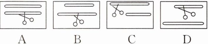 4. 如图,每个盒子里都有两根小棒,把其中的一根小棒用剪刀按图中所示的位置剪成两段,这两段小棒再与另一根小棒首尾相接,能够围成一个三角形的是(
